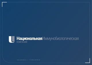 Документ описывает государственную корпорацию "Ростех" и ее холдинговую компанию "Национальная иммунобиологическая компания", создаваемую для разработки и производства лекарственных средств и медицинских продуктов в России. Среди ключевых направлений деятельности компании - разработка вакцин и препаратов для лечения инфекционных заболеваний, а также создание научно-технического совета. Документ также содержит информацию о производственных активов и научном потенциале холдинга.