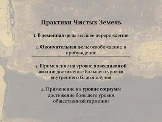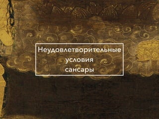 Документ обсуждает основы кармы, сансары и пути к освобождению в буддизме, включая причинно-следственные связи и практики для достижения внутреннего благополучия и общественной гармонии. Он подчеркивает важность осмысления дуккхи и самосострадания как способов развития подлинного отречения, а также описывает четыре благородные истины как ключевые факторы на пути к освобождению. В финале акцентируется внимание на природе будды и пути, ведущем к угасанию причин страдания.