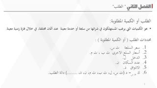 يتناول الفصل الثاني من الوثيقة مفهوم الطلب على السلع والخدمات وعوامل تحديد الكمية المطلوبة منها، مثل السعر والدخل وعدد السكان. كما يشرح قانون الطلب الذي ينص على وجود علاقة عكسية بين السعر والكمية المطلوبة. ويوضح كيفية كتابة دالة الطلب لتمثيل هذه العلاقة رياضياً.