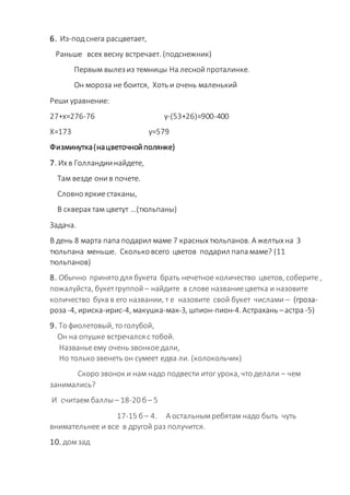 Урок математики в 2 «б» классе посвящен устным вычислениям в пределах 1000, целью которого является улучшение навыков сложения и вычитания. На занятии используется тема весны, в том числе работа с примерами, уравнениями и задачами, которые связаны с весенними цветами. Завершается урок оценкой результатов работы и рефлексией учащихся на тему трудности и интереса занятия.