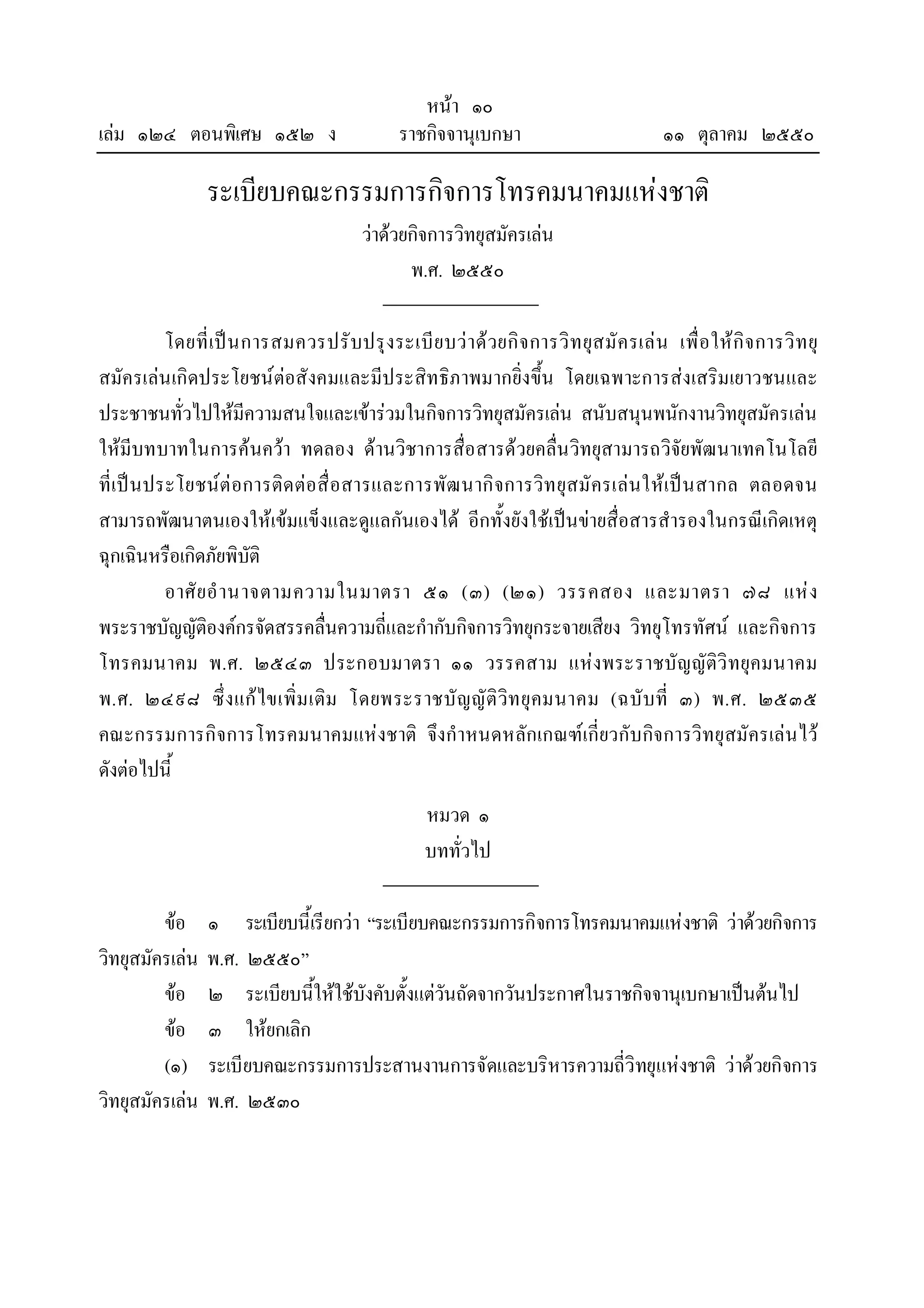 ตอนพิเศษ ๑๕๒ ง ราชกิจจานุเบกษา ๑๑ ตุลาคม ๒๕๕๐ ระเบียบคณะกรรมการกิจการโทรคมนาคมแหงชาติ วาดวยกิจการวิทยุสมัครเลน พ.ศ. ๒๕๕๐ โดยที่ เป น การสมควรปรั บปรุ ง ระเบี ย บว า ด วยกิ จ การวิ ท ยุส มั ค รเล น เพื่ อ ให กิ จ การวิ ท ยุ สมัครเลน เกิดประโยชนตอสังคมและมีประสิทธิภาพมากยิ่งขึ้น โดยเฉพาะการสงเสริมเยาวชนและ ประชาชนทั่วไปใหมความสนใจและเขารวมในกิจการวิทยุสมัครเลน สนับสนุนพนักงานวิทยุสมัครเลน ี ใหมีบทบาทในการคนควา ทดลอง ดานวิชาการสื่อสารดวยคลื่น วิทยุสามารถวิจัยพัฒนาเทคโนโลยี ที่เป น ประโยชนต อการติด ตอสื่ อสารและการพัฒ นากิ จการวิท ยุสมั ครเลน ใหเป น สากล ตลอดจน สามารถพัฒนาตนเองใหเขมแข็งและดูแลกันเองได อีกทั้งยังใชเปนขายสื่อสารสํารองในกรณีเกิดเหตุ ฉุกเฉินหรือเกิดภัยพิบัติ อาศั ย อํ า นาจตามความในมาตรา ๕๑ (๓) (๒๑) วรรคสอง และมาตรา ๗๘ แห ง พระราชบัญญัติองคกรจัดสรรคลื่นความถี่และกํากับกิจการวิทยุกระจายเสียง วิทยุโทรทัศน และกิจการ โทรคมนาคม พ.ศ. ๒๕๔๓ ประกอบมาตรา ๑๑ วรรคสาม แหงพระราชบัญญัติวิ ทยุคมนาคม พ.ศ. ๒๔๙๘ ซึ่ ง แก ไขเพิ่ม เติม โดยพระราชบั ญญั ติ วิท ยุ คมนาคม (ฉบั บที่ ๓) พ.ศ. ๒๕๓๕ คณะกรรมการกิจการโทรคมนาคมแหงชาติ จึงกําหนดหลักเกณฑเกี่ยวกับกิจการวิทยุสมัครเลน ไว ดังตอไปนี้ หมวด ๑ บททั่วไป ขอ ๑ ระเบียบนี้เรียกวา “ระเบียบคณะกรรมการกิจการโทรคมนาคมแหงชาติ วาดวยกิจการ วิทยุสมัครเลน พ.ศ. ๒๕๕๐” ขอ ๒ ระเบียบนี้ใหใชบังคับตั้งแตวันถัดจากวันประกาศในราชกิจจานุเบกษาเปนตนไป ขอ ๓ ใหยกเลิก (๑) ระเบียบคณะกรรมการประสานงานการจัดและบริหารความถี่วิทยุแหงชาติ วาดวยกิจการ วิทยุสมัครเลน พ.ศ. ๒๕๓๐