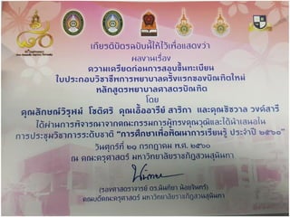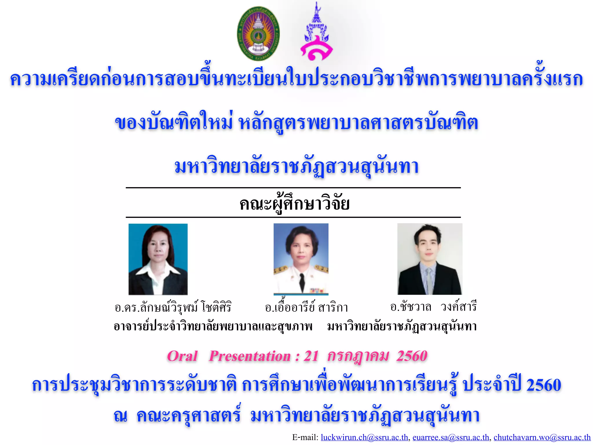 ลักษณ์วิรุฬม์ โชติศิริ, เอื้ออารีย์ สาริกา, และชัชวาล วงค์สารี.ความเครียดก่อนการสอบขึ้นทะเบียนใบประกอบวิชาชีพการพยาบาลครั้งแรกของบัณฑิตใหม่ หลักสูตรพยาบาลศาสตรบัณฑิต มหาวิทยาลัยราชภัฏสวนสุนันทา. นำเสนอด้วยวาจาในการประชุมระดับชาติ การศึกษาเพื่อพัฒนาการเรียนรู้ ประจำปี 2560, 21 กรกฎาคม 2560 ณ คณะครุศาสตร์ มหาวิทยาลัยราชภัฏสวนสุนันทา. (ppt presentation Research)