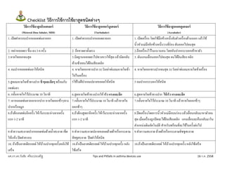 Tips and Pitfalls in asthma devices use 16 ก.ค. 2558 วิธีการใช้ยาสูดอินเฮเลอร์ (Metered Dose Inhaler, MDI) วิธีการใช้ยาสูดเทอร์บูเฮเลอร์ (Turbuhaler) วิธีการใช้ยาสูดแอคคูเฮเลอร์ (Accuhaler) 1. เปิดฝาครอบปากหลอดพ่นยาออก 1. เปิดฝาครอบปากหลอดยาออก 1. เปิดเครื่อง โดยใช้มือข้างหนึ่งจับตัวเครื่องด้านนอก แล้วใช้ นิ้วหัวแม่มืออีกข้างหนึ่งวางที่ร่อง ดันออกไปจนสุด 2. เขย่าหลอดยา ขึ้น-ลง 3-4 ครั้ง 2. ถือขวดยาตั้งตรง 2.ถือเครื่องไว้ในแนวนอน โดยหันปากกระบอกเข้าหาตัว 3.หายใจออกจนสุด 3.บิดฐานหลอดยาไปทางขวาให้สุด แล้วบิดกลับ ด้านซ้ายจนได้ยินเสียงคลิก 3. ดันแกนเลื่อนออกไปจนสุด จนได้ยินเสียง คลิก 4. อมปากหลอดพ่นยาให้สนิท 4. หายใจออกทางปาก ระวังอย่าพ่นลมหายใจเข้า ไปในเครื่อง 4. หายใจออกทางปากจนสุด ระวังอย่าพ่นลมหายใจเข้าเครื่อง 5.สูดลมหายใจเข้าทางปาก ช้าๆและลึกๆ พร้อมกับ กดพ่นยา 5ใช้ริมฝีปากอมปลายหลอดให้สนิท 5 อมปากกระบอกให้สนิท 6. กลั้นหายใจไว้ประมาณ 10 วินาที 6.สูดหายใจเข้าทางปากให้ เร็ว แรงและลึก 6.สูดหายใจเข้าทางปาก ให้เร็ว แรงและลึก 7. เอาหลอดพ่นยาออกจากปาก หายใจออกช้าๆทาง ปากหรือจมูก 7.กลั้นหายใจไว้ประมาณ 10 วินาที แล้วหายใจ ออกช้าๆ 7.กลั้นหายใจไว้ประมาณ 10 วินาที แล้วหายใจออกช้าๆ 8.ถ้าต้องกดพ่นอีกครั้ง ให้เว้นระยะห่างจากครั้ง แรก 1-2 นาที 8.ถ้าต้องสูดยาอีกครั้ง ให้เว้นระยะห่างจากครั้ง แรก 1-2 นาที 8.ปิดเครื่องโดยการนิ้วหัวแม่มือบนร่อง แล้วเลื่อนกลับมาหาตัวจน สุด เมื่อเครื่องถูกปิดจะได้ยินเสียงคลิก แกนเลื่อนจะคืนกลับมาใน ตาแหน่งเดิมอัตโนมัติ สาหรับพร้อมที่จะใช้ในครั้งต่อไป 9.ทาความสะอาดปากหลอดพ่นด้วยน้าสะอาด เช็ด ให้แห้ง ปิดฝาครอบ 9.ทาความสะอาดปลายหลอดด้วยผ้าหรือกระดาษ ทิชชูสะอาด ปิดฝาให้สนิท 9.ทาความสะอาด ด้วยผ้าหรือกระดาษทิชชูสะอาด 10. ถ้าเป็นยาสเตียรอยด์ ให้บ้วนปากทุกครั้งหลังใช้ เสร็จ 10.ถ้าเป็นยาสเตียรอยด์ ให้บ้วนปากทุกครั้ง หลัง ใช้เสร็จ 10.ถ้าเป็นยาสเตียรอยด์ ให้บ้วนปากทุกครั้ง หลังใช้เสร็จ