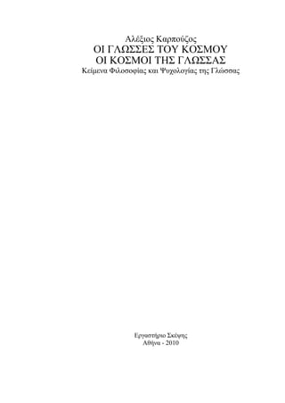 Το εγχειρίδιο «Οι Κόσμοι της Γλώσσας – Οι Γλώσσες του Κόσμου» του συγγραφέα Αλέξη Καρπούζου, αποτελεί μια πολυπρισματική διερεύνηση του γλωσσικού φαινομένου, πάντα, όμως, με την εποπτεία του φιλοσοφικού στοχασμού. Γίνεται επέκταση και σε μεταφυσικούς…