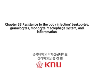 1. Leukocytes (white blood cells) play an important role in the body's immune defense against infection. They are divided into granulocytes like neutrophils and macrophages, which provide innate immunity through phagocytosis, and lymphocytes/plasma cells, which provide adaptive immunity.