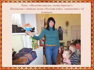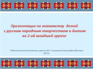 Документ описывает программу занятий для детей группы номер 1, подготовленную воспитателем Александрой Юрьевной Соловьевой в 2017 году. Темы занятий включают посещение музея 'Русская изба', знакомство с народными играми и песнями, а также изучение традиционных русских игрушек и оберегов. Дети также знакомятся с процессом приготовления пищи в печи.