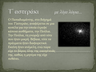 Ο Παπαδιαμάντης, στοδιήγημά του Τ’αστεράκι , αναφέρεται σε μια κοπέλα για την οποία έτρεφε κάποια αισθήματα, την Πούλια. Την Πούλια, τη γνώριζε από τότε που ήταν μικρή. Βέβαια, τότε τα πράγματα ήταν διαφορετικά. Εκείνη ήταν ανέμελη, ενώ τώρα είχε το βάρος όλης της οικογένειάς της, καθώς η μητέρα της είχε πεθάνει.