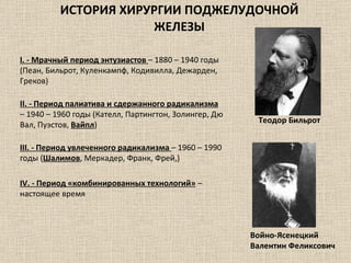 Доклад посвящен истории хирургии поджелудочной железы с подразделением на четыре ключевых периода, начиная с 1880 года до настоящего времени. Рассматриваются различные виды операций при хроническом панкреатите, включая дренирующие операции и резекции. Институт гастроэнтерологии подчеркивает свои преимущества в лечении заболеваний поджелудочной железы с минимальными рисками для пациентов.