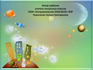 Документ представляет собой шаблон презентации, разработанный учителем начальных классов Галиной Чумаченко. Для создания шаблона использованы элементы детского скрап-набора 'Твоя любовь к луне'. Указана ссылка на источник скрап-набора.