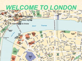 The document provides details about several famous London landmarks. It describes The Tower of London as a historic site that was once a palace, prison, and zoo, and is now home to the Crown Jewels. Tower Bridge is highlighted as a modern attraction where visitors can learn about its history. The Houses of Parliament, also known as the Palace of Westminster, is outlined as the home of the British Government. Big Ben, one of the most famous clocks in the world, is noted as being located in the Clock Tower within the Houses of Parliament. St. Paul's Cathedral is summarized as the most impressive church in London, rebuilt after the Great Fire under the design of Sir Christopher Wren. Buckingham Palace is presented as the London