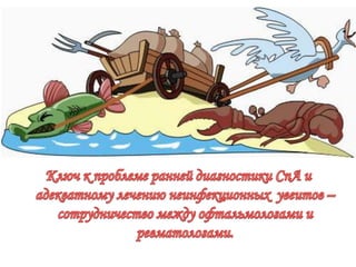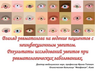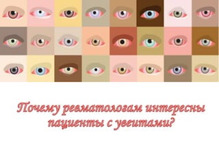 Документ описывает связь между воспалительными ревматическими заболеваниями, такими как анкилозирующий спондилит (АС) и увеит, акцентируя внимание на их клинических проявлениях, диагностических критериях и генетических аспектах, связанных с HLA-B27. Увеит часто является ранним симптомом АС и может указывать на более тяжёлый ход заболевания с высоким риском рецидивов. Исследование также подчеркивает важность своевременной диагностики и направлений пациентов с увеитом к ревматологам для улучшения результатов лечения.