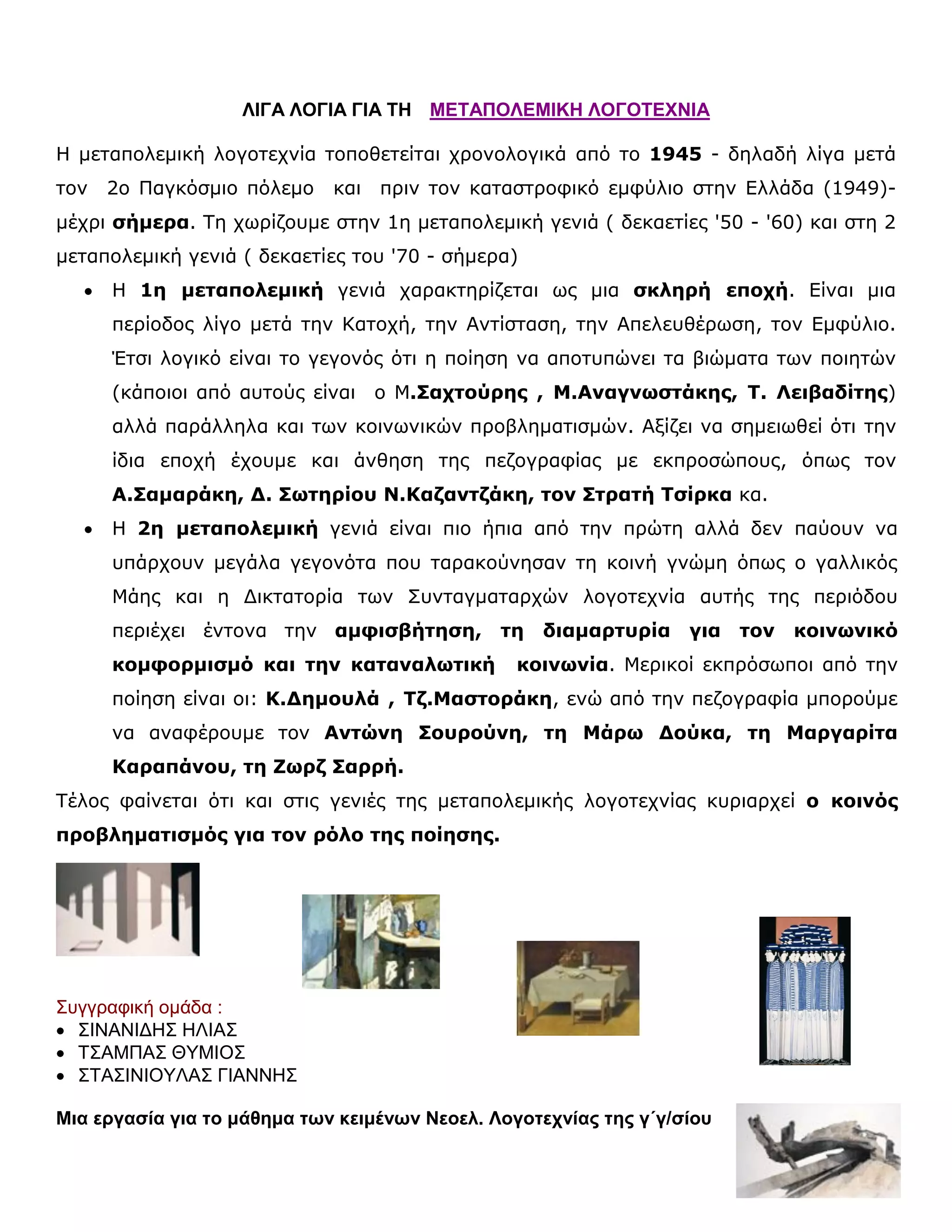 ΤΗ ΜΕΤΑΠΟΛΕΜΙΚΗ ΛΟΓΟΤΕΧΝΙΑ Η κεηαπνιεκηθή ινγνηερλία ηνπνζεηείηαη ρξνλνινγηθά από ην 1945 - δειαδή ιίγα κεηά ηνλ 2ν Παγθόζκην πόιεκν θαη πξηλ ηνλ θαηαζηξνθηθό εκθύιην ζηελ Ειιάδα (1949)- κέρξη ζήμερα. Τε ρωξίδνπκε ζηελ 1ε κεηαπνιεκηθή γεληά ( δεθαεηίεο '50 - '60) θαη ζηε 2 κεηαπνιεκηθή γεληά ( δεθαεηίεο ηνπ '70 - ζήκεξα) Η 1ε μεηαπολεμική γεληά ραξαθηεξίδεηαη ωο κηα ζκλερή εποτή. Είλαη κηα πεξίνδνο ιίγν κεηά ηελ Καηνρή, ηελ Αληίζηαζε, ηελ Απειεπζέξωζε, ηνλ Εκθύιην. Έηζη ινγηθό είλαη ην γεγνλόο όηη ε πνίεζε λα απνηππώλεη ηα βηώκαηα ηωλ πνηεηώλ (θάπνηνη από απηνύο είλαη ν Μ.Σατηούρες , Μ.Αναγνωζηάκες, Τ. Λειβαδίηες) αιιά παξάιιεια θαη ηωλ θνηλωληθώλ πξνβιεκαηηζκώλ. Αμίδεη λα ζεκεηωζεί όηη ηελ ίδηα επνρή έρνπκε θαη άλζεζε ηεο πεδνγξαθίαο κε εθπξνζώπνπο, όπωο ηνλ Α.Σαμαράκε, Δ. Σωηερίοσ Ν.Καδανηδάκε, ηον Σηραηή Τζίρκα θα. Η 2ε μεηαπολεμική γεληά είλαη πην ήπηα από ηελ πξώηε αιιά δελ παύνπλ λα ππάξρνπλ κεγάια γεγνλόηα πνπ ηαξαθνύλεζαλ ηε θνηλή γλώκε όπωο ν γαιιηθόο Μάεο θαη ε Δηθηαηνξία ηωλ Σπληαγκαηαξρώλ ινγνηερλία απηήο ηεο πεξηόδνπ πεξηέρεη έληνλα ηελ αμθιζβήηεζε, ηε διαμαρησρία για ηον κοινωνικό κομθορμιζμό και ηεν καηαναλωηική κοινωνία. Μεξηθνί εθπξόζωπνη από ηελ πνίεζε είλαη νη: Κ.Δεμοσλά , Τδ.Μαζηοράκε, ελώ από ηελ πεδνγξαθία κπνξνύκε λα αλαθέξνπκε ηνλ Ανηώνε Σοσρούνε, ηε Μάρω Δούκα, ηε Μαργαρίηα Καραπάνοσ, ηε Ζωρδ Σαρρή. Τέινο θαίλεηαη όηη θαη ζηηο γεληέο ηεο κεηαπνιεκηθήο ινγνηερλίαο θπξηαξρεί ο κοινός προβλεμαηιζμός για ηον ρόλο ηες ποίεζες. Συγγραφική ομάδα : ΣΙΝΑΝΙΔΗΣ ΗΛΙΑΣ ΤΣΑΜΠΑΣ ΘΥΜΙΟΣ ΣΤΑΣΙΝΙΟΥΛΑΣ ΓΙΑΝΝΗΣ Μια εργασία για το μάθημα των κειμένων Νεοελ. Λογοτετνίας της γ΄γ/σίοσ