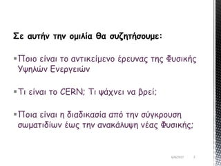 Στην παρουσίαση αυτή μαθαίνουμε τι αναζητά η Φυσική Στοιχειωδών Σωματιδίων. Ποιά είναι τα ανοιχτά ερωτήματα; τί είναι το CERN και πως μελετά τα δεδομένα από τις συγκρούσεις σωματιδίων;