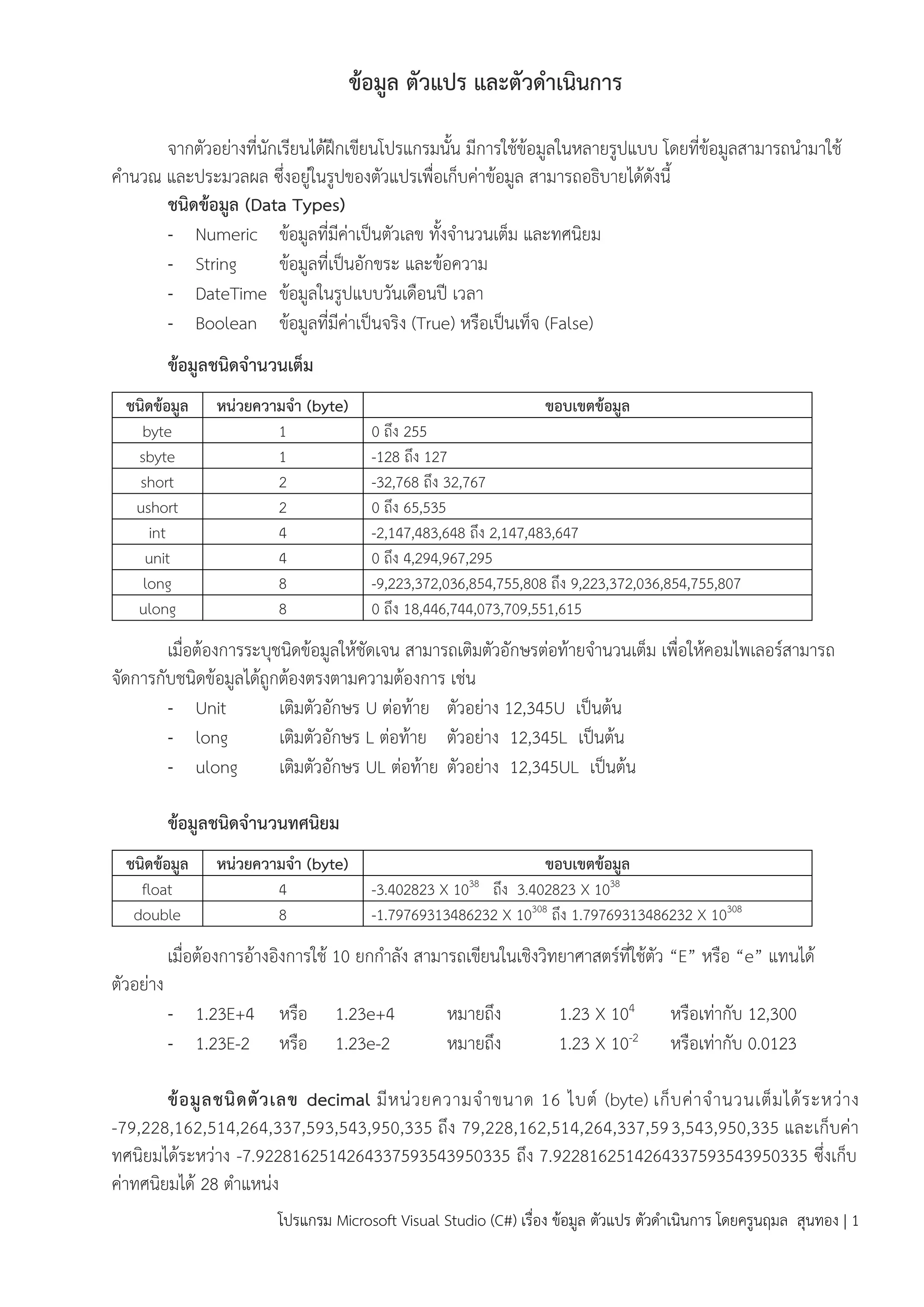 โปรแกรม Microsoft VisualStudio (C#) เรื่อง ข้อมูล ตัวแปร ตัวดำเนินกำร โดยครูนฤมล สุนทอง | 2