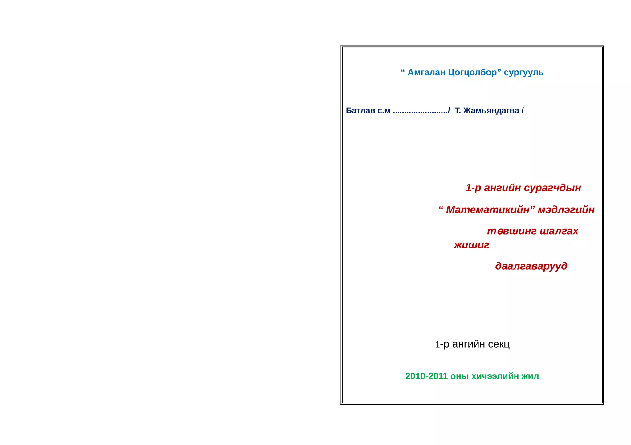 сургууль Батлав с.м ......................../ Т. Жамьяндагва / 1-р ангийн сурагчдын “ Математикийн” мэдлэгийн төвшинг шалгах жишиг даалгаварууд 1-р ангийн секц 2010-2011 оны хичээлийн жил
