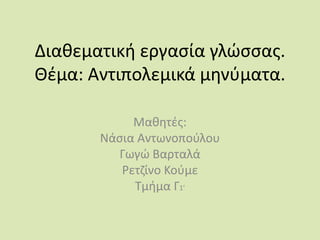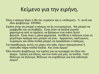Κείμενο για τηνειρήνη.Όλος ο κόσμος ξέρει τι θα πει «ειρήνη» και τι «πόλεμος». Γι αυτό και όλοι ψηφίζουμε ΕΙΡΗΝΗ.Ειρήνη είναι να μπορεί ο κόσμος να ζει ευτυχισμένος. Να μπορεί να μορφωθεί και να διαβάζει. Είναι όταν τα παιδιά γυρνάν χαρούμενα από το σχολείο, να βρίσκουν ένα πιάτο ζεστό φαγητό. Είναι όταν η μάνα χαμογελά. Αντίθετα ο πόλεμος είναι το χειρότερο πράγμα που μπορεί να γίνει. Αρρώστιες, σκοτωμούς, πυρκαγιές και άλλα πολλά μπορεί να προκαλέσει ο πόλεμος.Για παράδειγμα, αυτές τις μέρες στο Ιράκ, έχουν τραυματιστεί ή σκοτωθεί πάρα πολλά παιδιά. Και είναι κρίμα!Όλοι λοιπόν ψηφίζουμε την ειρήνη για να κυριαρχεί σε όλον τον κόσμο. Ειρήνη για όλους, και πιο πολύ για μας, τα παιδιά. Γιατί θέλουμε να ζήσουμε, θέλουμε να ευχηθούμε για ένα καλύτερο αύριο!