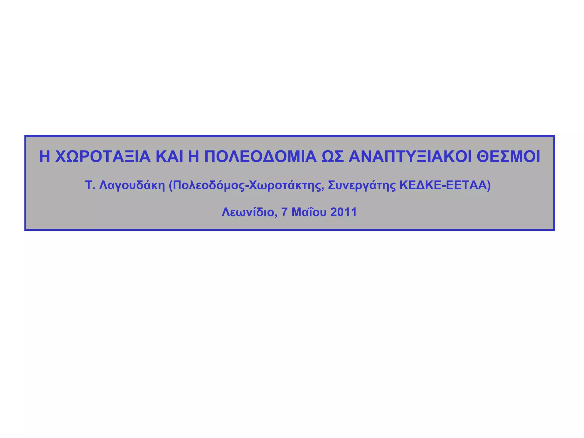 Η ΧΩΡΟΤΑΞΙΑ ΚΑΙΗ ΠΟΛΕΟΔΟΜΙΑ ΩΣ ΑΝΑΠΤΥΞΙΑΚΟΙ ΘΕΣΜΟΙ Τ. Λαγουδάκη (Πολεοδόμος-Χωροτάκτης, Συνεργάτης ΚΕΔΚΕ-ΕΕΤΑΑ) Λεωνίδιο, 7 Μαΐου 2011