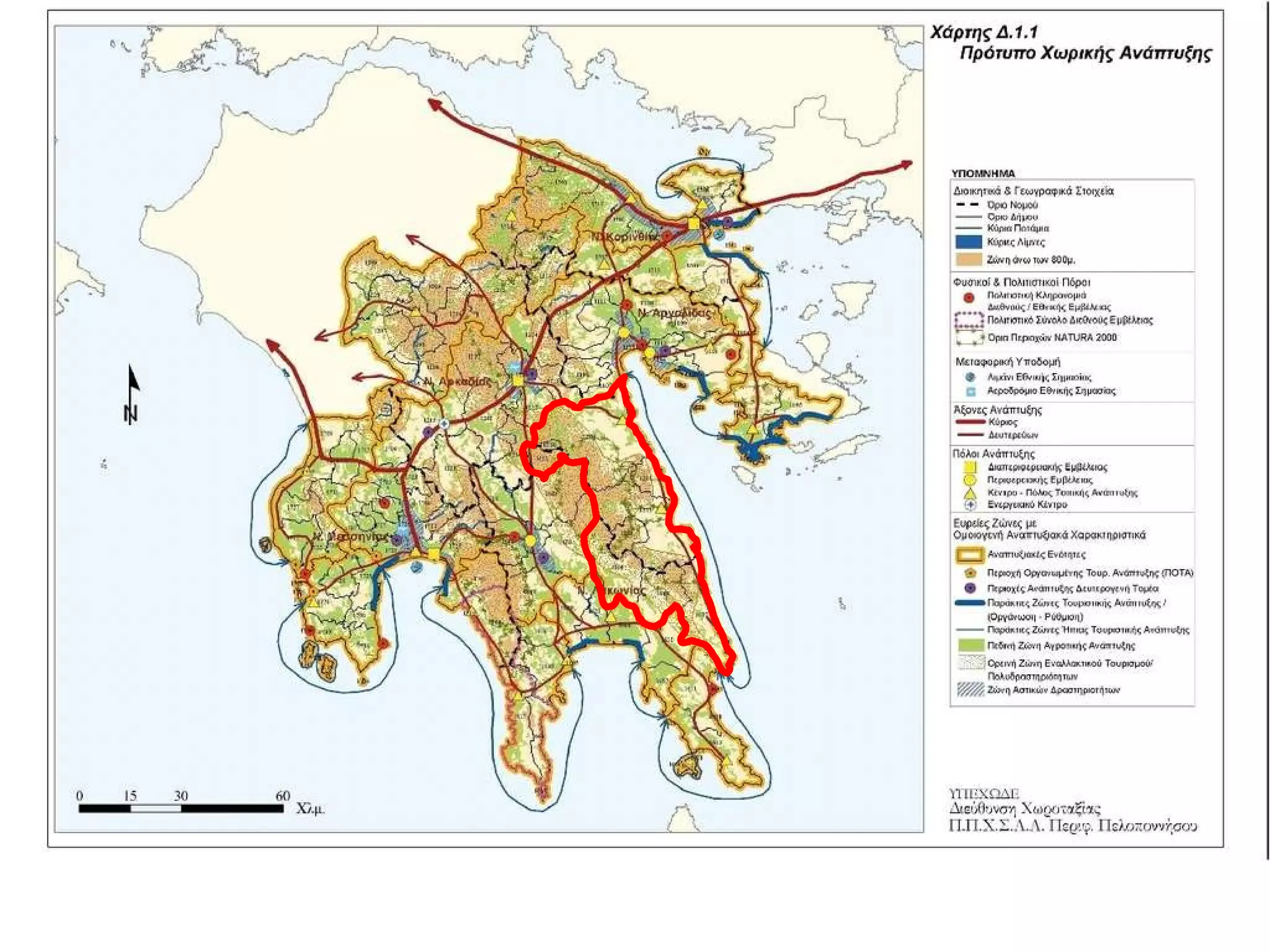 Σύμφωνα με τιςΠροβλέψεις - Κατευθύνσεις ΠΠΧΣΑΑ Πελοποννήσου – 2003: Ο νέος Δήμος εντάσσεται στην: ευρύτερη αναπτυξιακή ενότητα ορεινής περιοχής Αρκαδίας και Λακωνίας (Πάρνωνα) που αποτελεί ορεινή περιοχή με δυνατότητες αγροτικής ανάπτυξης ήπιων δραστηριοτήτων εναλλακτικών μορφών τουρισμού και αναψυχής.