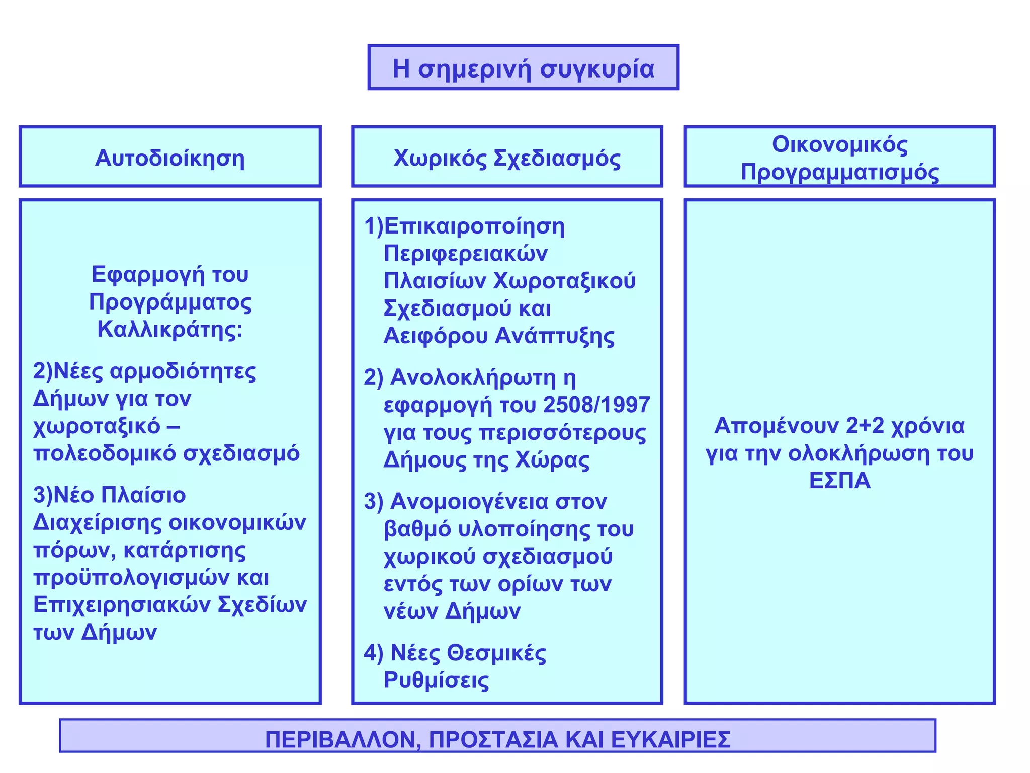 Η σημερινή συγκυρίαΑυτοδιοίκηση Χωρικός Σχεδιασμός Οικονομικός Προγραμματισμός Εφαρμογή του Προγράμματος Καλλικράτης: Νέες αρμοδιότητες Δήμων για τον χωροταξικό –πολεοδομικό σχεδιασμό Νέο Πλαίσιο Διαχείρισης οικονομικών πόρων, κατάρτισης προϋπολογισμών και Επιχειρησιακών Σχεδίων των Δήμων 1)Επικαιροποίηση Περιφερειακών Πλαισίων Χωροταξικού Σχεδιασμού και Αειφόρου Ανάπτυξης 2) Ανολοκλήρωτη η εφαρμογή του 2508/1997 για τους περισσότερους Δήμους της Χώρας 3) Ανομοιογένεια στον βαθμό υλοποίησης του χωρικού σχεδιασμού εντός των ορίων των νέων Δήμων 4) Νέες Θεσμικές Ρυθμίσεις Απομένουν 2+2 χρόνια για την ολοκλήρωση του ΕΣΠΑ ΠΕΡΙΒΑΛΛΟΝ, ΠΡΟΣΤΑΣΙΑ ΚΑΙ ΕΥΚΑΙΡΙΕΣ