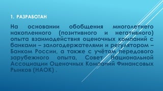 Документ описывает предложенные изменения в федеральный стандарт оценки для целей залога, разработанные Национальной ассоциацией оценочных компаний финансовых рынков в России. Основное внимание уделяется улучшению существующего стандарта, разделению понятий рыночной и справедливой стоимости, а также методам оценки различных объектов залога. В документе также рассматриваются новые подходы к оценке и краткие формы отчетности.