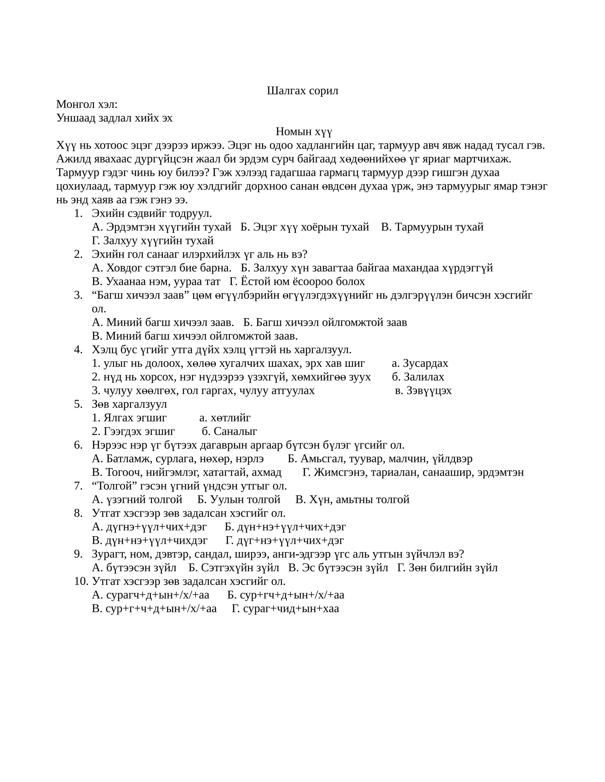 задлал хийх эх Номын хүү Хүү нь хотоос эцэг дээрээ иржээ. Эцэг нь одоо хадлангийн цаг, тармуур авч явж надад тусал гэв. Ажилд явахаас дургүйцсэн жаал би эрдэм сурч байгаад хөдөөнийхөө үг яриаг мартчихаж. Тармуур гэдэг чинь юу билээ? Гэж хэлээд гадагшаа гармагц тармуур дээр гишгэн духаа цохиулаад, тармуур гэж юу хэлдгийг дорхноо санан өвдсөн духаа үрж, энэ тармуурыг ямар тэнэг нь энд хаяв аа гэж гэнэ ээ. 1. Эхийн сэдвийг тодруул. А. Эрдэмтэн хүүгийн тухай Б. Эцэг хүү хоёрын тухай В. Тармуурын тухай Г. Залхуу хүүгийн тухай 2. Эхийн гол санааг илэрхийлэх үг аль нь вэ? А. Ховдог сэтгэл бие барна. Б. Залхуу хүн завагтаа байгаа махандаа хүрдэггүй В. Ухаанаа нэм, уураа тат Г. Ёстой юм ёсоороо болох 3. “Багш хичээл заав” цөм өгүүлбэрийн өгүүлэгдэхүүнийг нь дэлгэрүүлэн бичсэн хэсгийг ол. А. Миний багш хичээл заав. Б. Багш хичээл ойлгомжтой заав В. Миний багш хичээл ойлгомжтой заав. 4. Хэлц бус үгийг утга дүйх хэлц үгтэй нь харгалзуул. 1. улыг нь долоох, хөлөө хугалчих шахах, эрх хав шиг а. Зусардах 2. нүд нь хорсох, нэг нүдээрээ үзэхгүй, хөмхийгөө зуух б. Залилах 3. чулуу хөөлгөх, гол гаргах, чулуу атгуулах в. Зэвүүцэх 5. Зөв харгалзуул 1. Ялгах эгшиг а. хөтлийг 2. Гээгдэх эгшиг б. Саналыг 6. Нэрээс нэр үг бүтээх дагаврын аргаар бүтсэн бүлэг үгсийг ол. А. Батламж, сурлага, нөхөр, нэрлэ Б. Амьсгал, туувар, малчин, үйлдвэр В. Тогооч, нийгэмлэг, хатагтай, ахмад Г. Жимсгэнэ, тариалан, санаашир, эрдэмтэн 7. “Толгой” гэсэн үгний үндсэн утгыг ол. А. үзэгний толгой Б. Уулын толгой В. Хүн, амьтны толгой 8. Утгат хэсгээр зөв задалсан хэсгийг ол. А. дүгнэ+үүл+чих+дэг Б. дүн+нэ+үүл+чих+дэг В. дүн+нэ+үүл+чихдэг Г. дүг+нэ+үүл+чих+дэг 9. Зурагт, ном, дэвтэр, сандал, ширээ, анги-эдгээр үгс аль утгын зүйчлэл вэ? А. бүтээсэн зүйл Б. Сэтгэхүйн зүйл В. Эс бүтээсэн зүйл Г. Зөн билгийн зүйл 10. Утгат хэсгээр зөв задалсан хэсгийг ол. А. сурагч+д+ын+/х/+аа Б. сур+гч+д+ын+/х/+аа В. сур+г+ч+д+ын+/х/+аа Г. сураг+чид+ын+хаа
