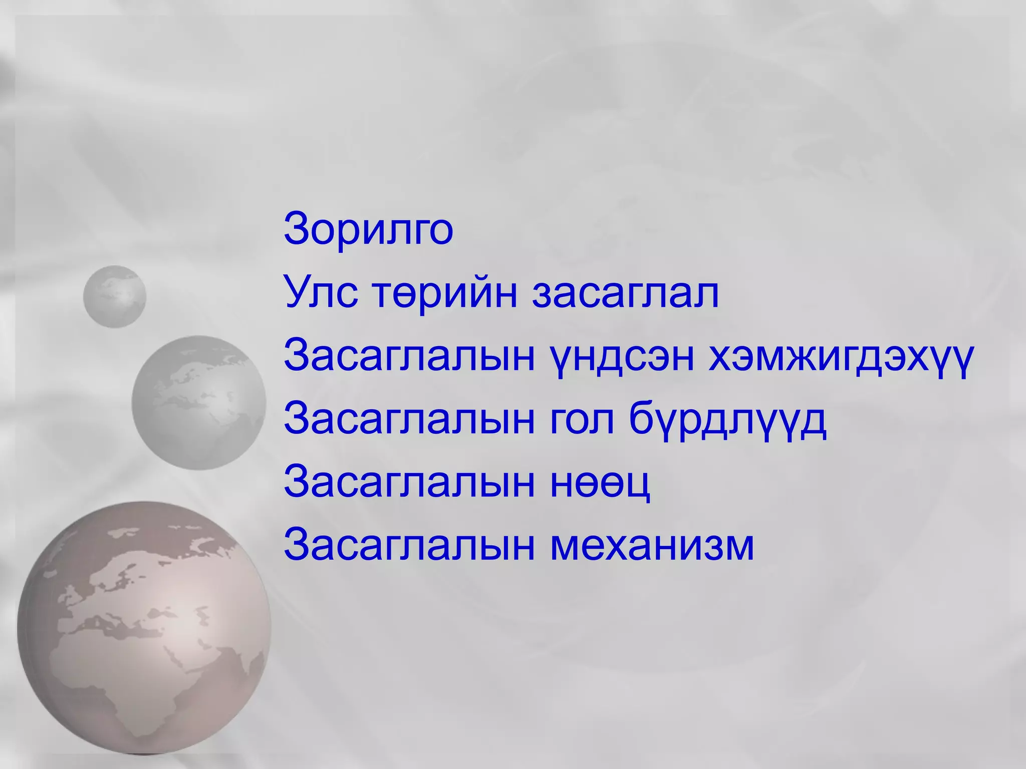 Зорилго Улс төрийнзасаглал Засаглалын үндсэн хэмжигдэхүүн Засаглалын гол бүрдлүүд Засаглалын нөөц Засаглалын механизм - 2.