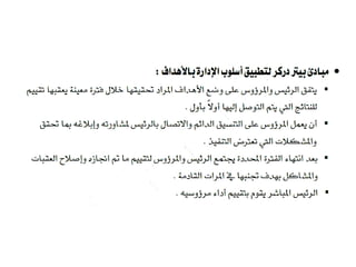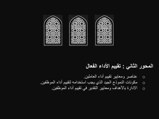 تتناول الوثيقة تقييم أداء العاملين ومعايير قياس هذا الأداء، حيث تبرز أهمية استخدام نموذج جيد يتضمن مكونات وظيفية مؤثرة. كما توضح الوثيقة عناصر عملية التقييم وطرق قياس الأداء التي تعتمد على معايير محددة تشمل النتائج والسلوكيات والصفات الشخصية. يُشير النص إلى دور الرؤساء والمرؤوسين في عملية التقييم وتأثيرها على فعالية الأداء في المنظمات.