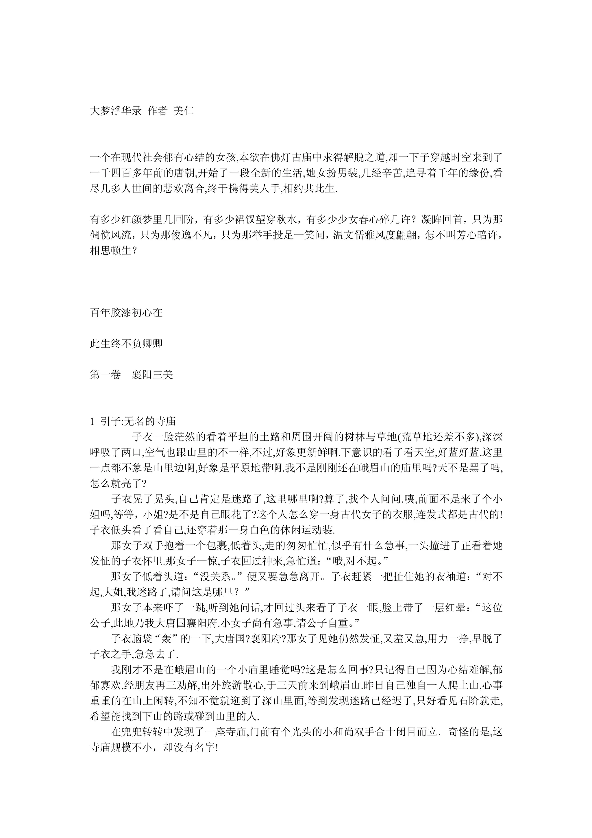 《大梦浮华录》讲述了一个现代女孩子衣因心结难解,从峨眉山寺庙穿越时空回到唐朝的故事。在古代,子衣女扮男装,经历了许多考验与人情世故,最终追寻千年缘分,与心爱之人相约共度余生。小说展现了跨越时空的爱情与女性在古代社会中的挣扎与成长。