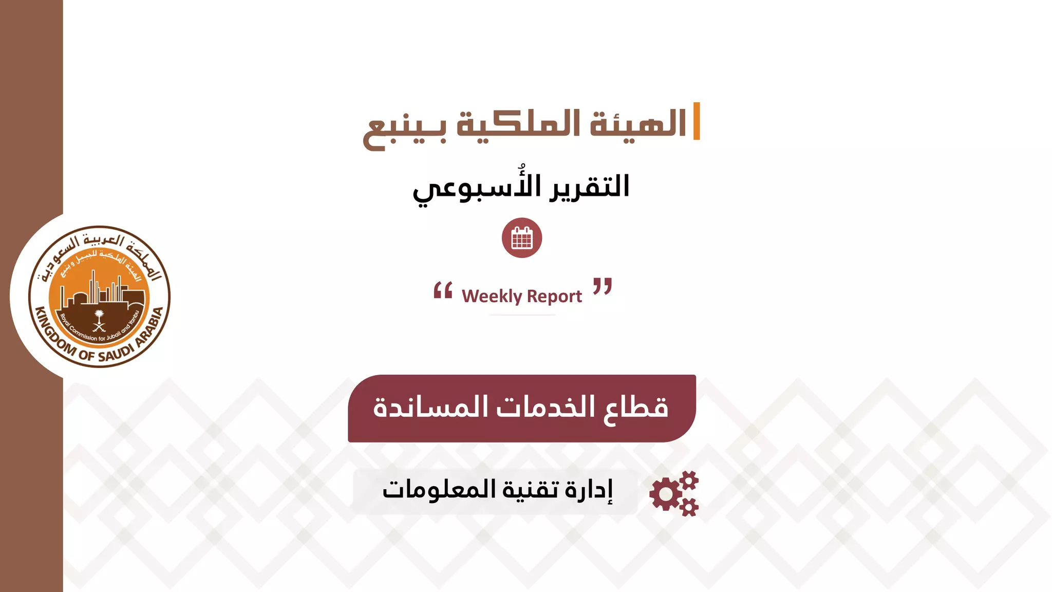 This weekly report from the Yanbu Royal Commission discusses the progress of several ongoing IT projects and initiatives across different departments. It provides updates on the status and achievements of applications development projects, data center infrastructure upgrades, security threats detected and resolved incidents. It also includes charts showing market share of internet providers in Yanbu and the distribution of resolved support tickets for the month.