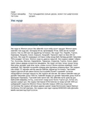 Гол гольдрилоо сольж урсах, эсвэл гол ширгэснээс тогтсон үүсдэг. Увс нуур Увс нуур нь Монгол улсын Увс аймгийн зүүн хойд хэсэгт оршдог, Монгол орны хамгийн том нуур юм. Уртаараа 84 км, өргөнөөрөө 79 км, 3350 ам км талбай эзэлнэ. Нас нь 200 сая гэж эрдэмтэд тогтоожээ. Увс нуурт Тэс, Нарийн, Түргэн, Хархираа, Хөндлөн, Сагил, Боршоо, Хандгайт, Торхилог зэрэг их бага 38 гол цутгана. Увс нуур Их нууруудын хотгорын хойд захад байх бөгөөд далайн төвшнөөс 759 м өндөрт тогтжээ. Энэхүү нуур нь давсны нөөцтэй. Энэ нуурын хөвөөг тойрон Тэс, Зүүнговь, Малчин, Наранбулаг, Тариалан, Улаангом, Түргэн, Сагил, Давст зэрэг сумын ардууд нүүдэллэн амьдарна. Увс нуурт ногтруу, галуу, хошуу галуу, бор галуу, ангидаг, шар алаг нугас, улаан хүзүүт болон шунхан шумбуур, гэзэгт шумбуур, 362 төрлийн нүүдлийн шувууд урин дулааны улиралд ирнэ. Увс нуурын сав газарт 72 төрлийн хөхтөн амьтан байгааг эрдэмтэд тогтоожээ. Төв Азийн гадагш урсгалгүй ай савын босоо бүслүүрийн бүхий л шинжийг тусгасан ландшафтын сонгодог жишээ нь Увс нуурын ай сав юм. Ай савын хамгийн нам цэг далайн төвшнөөс дээш 758,9 м, Хамгийн өндөр цэг далайн төвшнөөс дээш 4126 м өргөгдсөн Хархираа, Түргэний ноён оргил юм. Увс аймгийн нутаг дэвсгэр дэх, байгалийн өвөрмөц тогтоц, үзэсгэлэнт газар нутаг болох Түргэн уул, Алтан элс, Цагаан шувуут уул, Увс нуурыг багтаасан 679,6 мянган га газар нутгийг УИХ-ын шийдвэрийг үндэслэн Монгол Улсын Засгийн газрын 1994 оны есдүгээр тогтоолоор Увс нуурын ай савын дархан цаазат газар болгосноос гадна Оросын Холбооны Улстай хамтран, Увс нуурын сав гэдэг нэрээр ЮНЕСКО-гийн Дэлхийн өвийн жагсаалтад бүртгүүлсэн.