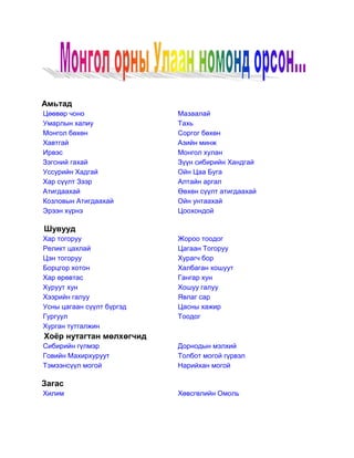 АмьтадЦөөвөр чоноМазаалайУмарлын халиуТахьМонголбөхөнСоргог бөхөнХавтгайАзийн минжИрвэсМонгол хуланЗэгсний гахайЗүүн сибирийн ХандгайУссурийн ХадгайОйн Цаа БугаХар сүүлт ЗээрАлтайн аргалАтигдаахайӨөхөн сүүлт атигдаахайКозловын АтигдаахайОйн унтаахайЭрээн хүрнэЦоохондой Шувууд Хар тогорууЖороо тоодогРеликт цахлайЦагаан ТогорууЦэн тогорууХурагч борБорцгор хотонХалбаган хошуутХар өрөвтасГангар хунХуруут хунХошуу галууХээрийн галууЯвлаг сарУсны цагаан сүүлт бүргэдЦасны хажирГургуулТоодогХурган тутгалжин Хоёр нутагтан мөлхөгчидСибирийн гүлмэрДорнодын мэлхийГовийн МахирхуруутТолбот могой гүрвэлТэмээнсүүл могойНарийхан могойЗагасХилимХөвсгөлийн Омоль<br />Цөөвөр чоно /Cuon Alpinus Pallas/<br />Цөөвөр чоно нь хөхтөн амьтны аймгийн махчдын баг болох нохдын овогт багтдаг. Биеийн урт 100 орчим см, сүүл 50см, Африк, Азийн өмнөд хэсэгт байдаг. Янгир, аргаль элбэгтэй хад цохиотой уулсаар байрладаг. Саарал чоноос биеэр бага, тод улаан, шаргал зүстэй, сагсгар сүүлтэй, сүрэглэн явж гөрөөс барьж иддэг. Алтайн өвөр говьд Аж богдын зүүн үзүүрээс Хачгийн уул нутагт үзэгддэг. Байгаль түүний нөөц баялгийг хамгаалах Олон улс<br />ын холбооны улаан номонд нэр нь орсон. МУ-ын ан агнуурын хуулинд цөөвөр чоно агнахыг хориглосон заалт оруулах, амьдрах зүйг нь судалж, хамгаалах арга хэмжээ боловсруулах зорилгоор хамгаалалтанд авсан <br />Умардын халиу /Lutra lutra Linnaeus/<br />Умардын халиу нь хөхтөн амьтны аймгийн махчдын баг болох суусрын овогт багтдаг. Манай улсын Халх голд Амгалантаас улсын хил хүртэл, Шишгэд голд Тэнгис Шишгэдийн бэлчрээс улсын хил хүртэл нутгуудаар үзэгддэг. Монгол улсан дхалиу агнахыг 1930 оноос хойш хуулиар хатуу хориглон дархалсан. Устах аюулд орж байгаа зэрлэг ургамал амьтны зүйлээс орон улсын худалдааны тухай 1973 оны конвенцийн I хавсралтанд орсон. Халх гол, Доод Шишгэдэд халиуны нөөц газар тогтоох, хадгалан байлгах, хамгаалах олшруулах зорилгоор хамгаалалтанд авсан. <br />Голын халиу /Lutra lutra/<br />Махчдын баг, суусар овог бөгөөд монголд нэг зүйл байдаг. Ус, хуурай газар амьдрах зохилдолгоотой махсаг амьтан. Биеийн урт 55-95 см мөч богинохон хурууны салаа арьсаар холбогдсон угаараа бүдүүн хөлтэй. Хүрэн халиун бор зүсмийн өтгөн ноолууртай, тачир үслэг, мөн махилзаж суналзсан өвөрмөц хөдөлгөөнтэй амьтан юм. <br /> <br />Монгол бөхөн /Saga tatarica mongolica/<br />Монгол бөхөн нь хөхтөн амьтны аймгийн хос туурайтны баг болох тугалмайтны овогт багтдаг. Дэлхийн гоц ховор амьтны нэг юм. Баглуур таана, монгол өвс бүхий хайрган хөрстэй бартаагүй, дагжуур, хэвгий ээрэм талд нутаглана. <br />Хавтгай /Camelus ferus, Przewalskii/<br />Хавтгай нь хөхтөн амьтны аймгийн хос туурайтны баг болох тэмээний овогт багтдаг. Дэлхийд гоц ховор амьтны нэг. Бие 250-360 орчим см урт, сэрвээгээрэ 180-210 см өндөр. Хоёр бөхт зэрлэг тэмээ. Хавтгай зэгзгэр бие, жижиг бөх, нарийн урт цац, тачир шингэн үс-зогдортой, цайвар зүстэй. Анатоми, амьдралын олон шинжээрээ гэрийн тэмээнээс ялгаатай.<br /> <br />Зэгсний гахай /Sus Scorfa nigripes blanford/<br />Зэгсний гахай нь хөхтөн амьтны аймгийн Хос туурайтны баг болох гахайн овогт багтдаг. Говь цөлийн баянбүрд, талын татам, нуурын эргийн зэгс шагшуурга, бутан ширэнгэ шугуйд байршдаг. Манайд Хар-Ус нуурын эргийн зэгс шагшуурган ширэнгэнлд тогтмол нутаглаж хааяа Хар нуур, Булган, Ховд голын сав, Зэрэгийн хөндий,Шаргын говьд тархсан. Зэгсний гахайг улсын бүртгэлд агнадаггүй. Нутгийнхан хув