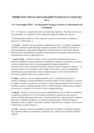 oт 1 септември 2016 г. за оценяване на резултатите от обучението на