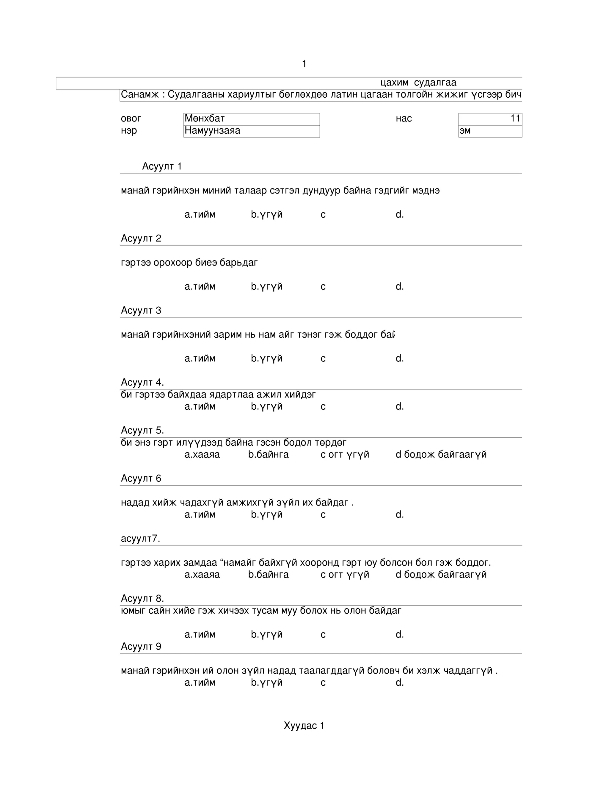 а.хааяа b.байнга c огт үгүй d бодож байгаагүй