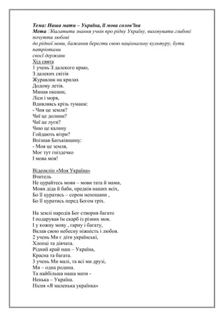 Мета :Збагатити знання учнів про рідну Україну, виховувати глибокі