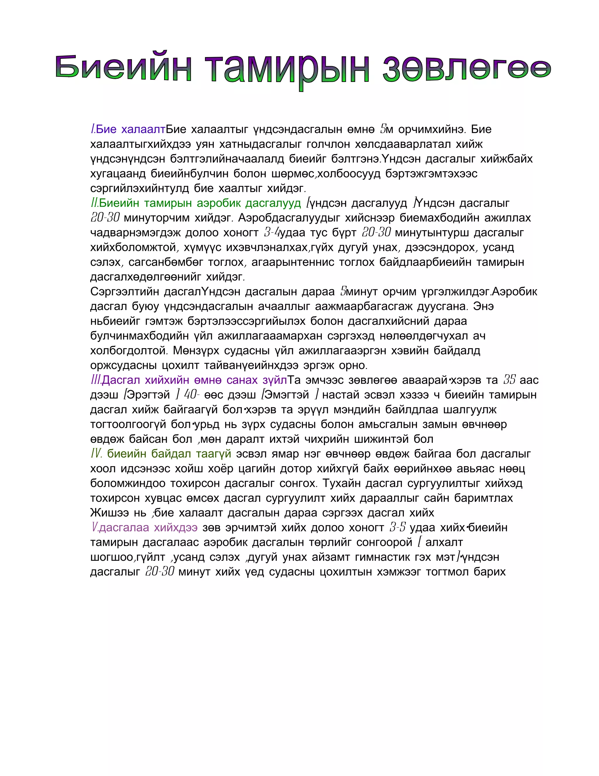 V.дасгалаа хийхдээ зөв эрчимтэй хийх долоо хоногт 3-5 удаа хийх•биеийн