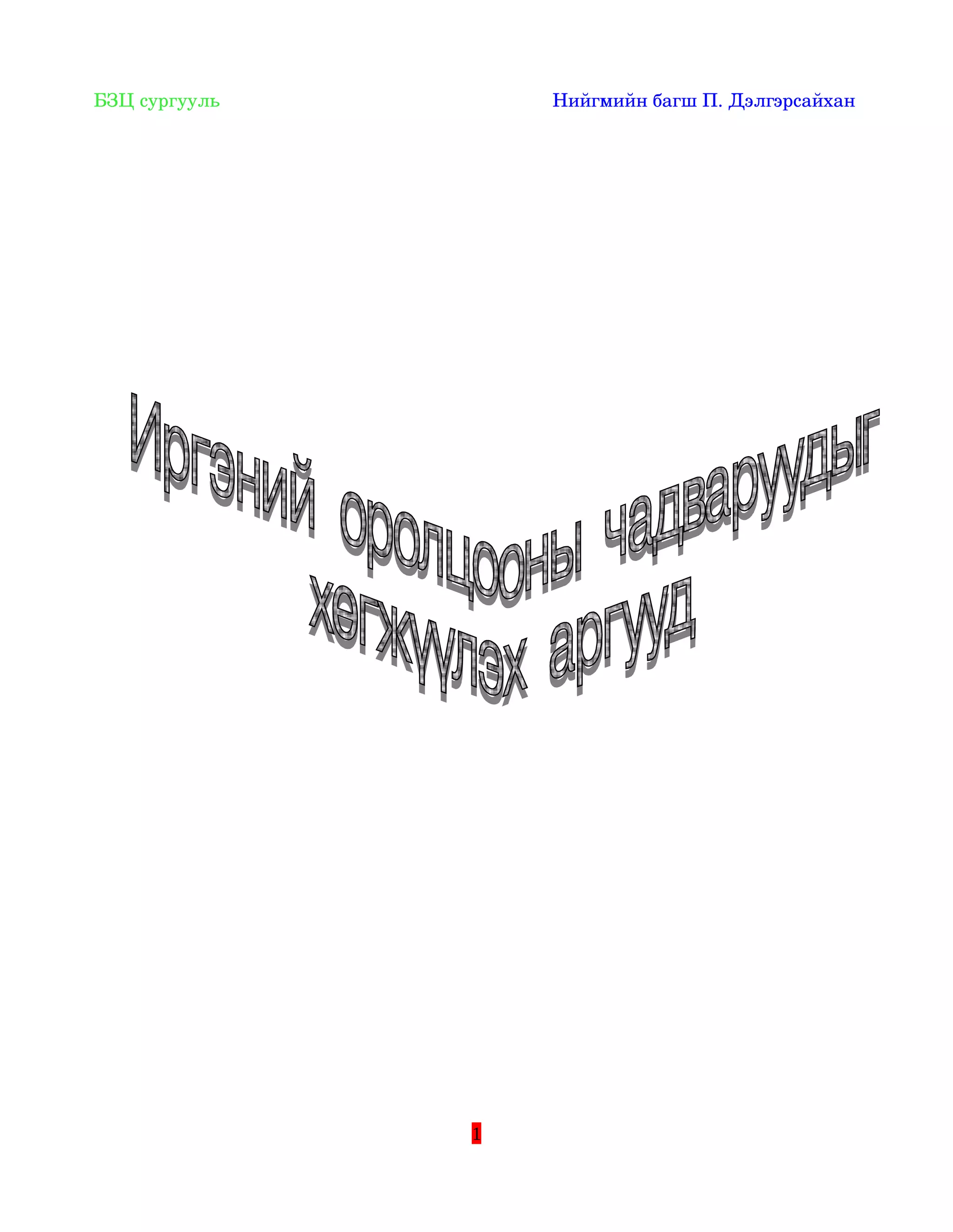 ӨРТӨӨЧЛӨЛИЙН АРГА Энэ аргыг багш бүлэг сэдвийн бататгал дүгнэлт хийж,сурагчдын мэдлэг чадварыг шалгахад ашиглаж болно. ЗОРИЛГО:Сурагчид хичээлээр суралцсан мэдлэгээ бусдад шалгуулах өөрийгөө болон бие биенээ үнэлэх шударга байх хандлагыг төлөвшүүлнэ. ҮЙЛ АЖИЛЛАГААНЫ ДАРААЛАЛ: • Суралцагчдыг 1-4 тоолуулан 4 өртөөнд хуваарилан баг болгоно. • Өртөөний ахлагчийг сонгоно. • Өртөө болгонд ижил тооны асуулт бүхий хуудас цаасыг тест хананд байрлуулна. • Өртөөнд ажиллах хугацаа ижил байх ба багууд байраа ямар нэг хонх болон дохиогоор солино. • Бүх өртөөөнд очиж ажиллаж дууссаны дараа ахлагчид дэвтрийг хураан авч өөрөө эсвэл харилцан солилцон дүгнэнэ. • Дүн оноог зөв хариултаас хэдийг нь хариулсан байдлаар тооцно. • Зөв хариултыг багш хэлж өгөх буюу том цаасан дээр бичиж хананд байрлуулна. АНХААРАХ ЗҮЙЛС: • Өртөөнд байх сурагчдын тоо хэтэрхий олон биш байна. • Асуулт хуулахгүй зөвхөн дугаараа тавьж хариултаа бичнэ. • Дүгнэхдээ шударга байна. • Даалгаварыг хананд өлгөхдөө харааны түвшинд хадна. • Хариулт олон үгээр биш богино хугацаанд ажиллаж болохоор нэг үгээр буюу нэг өгүүлбэрээр зохион байгуулна. II ХЭСЭГ. СУРАГЧДЫГ ХӨГЖҮҮЛЭХ АРГУУД Хөгжүүлэх аргууд нь суралцагчдад аль болох богино хугацаанд оновчтой шийдвэр гаргах,бусадтаЙ хамтран ажиллах,тэдний хувийн соёлыг ойлгох,хүндэтгэх зэрэг ардчилсан нийгмийн иргэний чадваруудад төлөвшүүлэхэд чиглэсэн байна. ВЕННДИАГРАММЫН АРГА Энэ аргыг хичээлд хэрэглэсэнээр хуулийн олон янзын ухагдахуунуудын ижил төсөөтэй ялгаатай талыг харьцуулан үзэж ач холбогдлыг нь тайлбарлана. ЗОРИЛГО: Сурагчдад хууль эрх зүйн үзэл баримтлал,ардчиллын үнэт чанарыг эзэмшүүлж, хуулийн талаар мэдлэгийг ялгаж чаддаг болно. ҮЙЛ АЖИЛЛАГААНЫ ДАРААЛАЛ: • ВЕННДИАГРАММЫН дугуйг самбарт буюу том цаасан дээр зурж бэлтгэнэ. • Энэ нь 2 огтлолцсон дугуйнаас бүрдэнэ.Жишээ нь: Өмчийн эрх зүй 5