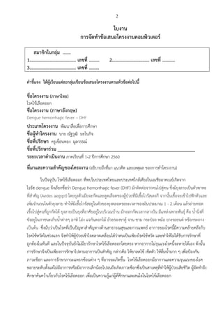 ......... 2…………………………… เลขที่ ........... 3………………………………….. เลขที่ ……… คาชี้แจง ให้ผู้เรียนแต่ละกลุ่มเขียนข้อเสนอโครงงานตามหัวข้อต่อไปนี้ ชื่อโครงงาน (ภาษาไทย) โรคไข้เลือดออก ชื่อโครงงาน (ภาษาอังกฤษ) Dengue hemorrhagic fever – DHF ประเภทโครงงาน พัฒนาสื่อเพื่อการศึกษา ชื่อผู้ทาโครงงาน นาย ณัฐวุฒิ มะโนกิจ ชื่อที่ปรึกษา ครูเขื่อนทอง มูลวรรณ์ ชื่อที่ปรึกษาร่วม _____________________________________________________________ ระยะเวลาดาเนินงาน ภาคเรียนที่ 1-2 ปีการศึกษา 2560 ที่มาและความสาคัญของโครงงาน (อธิบายถึงที่มา แนวคิด และเหตุผล ของการทาโครงงาน) ในปัจจุบัน โรคไข้เลือดออก ที่พบในประเทศไทยและประเทศใกล้เคียงในเอเชียอาคเนย์เกิดจาก ไวรัส dengue จึงเรียกชื่อว่า Dengue hemorrhagic fever (DHF) มักติดต่อจากคนไปสู่คน ซึ่งมียุงลายเป็นตัวพาหะ ที่สาคัญ (Aedes aegypt) โดยยุงตัวเมียจะกัดและดูดเลือดของผู้ป่วยที่มีเชื้อไวรัสเดงกี จากนั้นเชื้อจะเข้าไปฟักตัวและ เพิ่มจานวนในตัวยุงลาย ทาให้มีเชื้อไวรัสอยู่ในตัวของยุงตลอดระยะเวลาของมันประมาณ 1 - 2 เดือน แล้วถ่ายทอด เชื้อไปสู่คนที่ถูกกัดได้ ยุงลายเป็นยุงที่อาศัยอยู่ในบริเวณบ้าน มักออกกัดเวลากลางวัน มีแหล่งเพาะพันธุ์ คือ น้านิ่งที่ ขังอยู่ในภาชนะเก็บน้าต่างๆ อาทิ โอ่ง แจกันดอกไม้ ถ้วยรองขาตู้ จาน ชาม กระป๋อง หม้อ ยางรถยนต์ หรือกระถาง เป็นต้น ซึ่งนับว่าเป็นโรคที่เป็นปัญหาสาคัญทางด้านสาธารณสุขและการแพทย์ อาการของโรคนี้มีความคล้ายคลึงกับ โรคไข้หวัดในช่วงแรก จึงทาให้ผู้ป่วยเข้าใจคลาดเคลื่อนได้ว่าตนเป็นเพียงโรคไข้หวัด และทาให้ไม่ได้รับการรักษาที่ ถูกต้องในทันที และในปัจจุบันยังไม่มียารักษาโรคไข้เลือดออกโดยตรง หากอาการไม่รุนแรงโรคนี้จะหายได้เอง ดังนั้น การรักษาจึงเป็นเพียงการรักษาไปตามอาการเป็นสาคัญ กล่าวคือ ให้ยาลดไข้ เช็ดตัว ให้ดื่มน้ามาก ๆ เพื่อป้องกัน ภาวะช็อก และการรักษาภาวะแทรกซ้อนต่าง ๆ ที่อาจจะเกิดขึ้น โรคไข้เลือดออกมีอาการและความรุนแรงของโรค หลายระดับตั้งแต่ไม่มีอาการหรือมีอาการเล็กน้อยไปจนถึงเกิดภาวะช็อกซึ่งเป็นสาเหตุที่ทาให้ผู้ป่วยเสียชีวิต ผู้จัดทาจึง ศึกษาค้นคว้าเกี่ยวกับโรคไข้เลือดออก เพื่อเป็นความรู้แก่ผู้ที่ศึกษาและสนใจในโรคไข้เลือดออก
