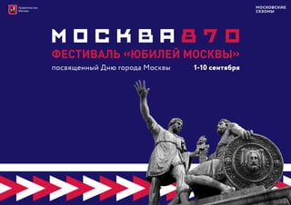 Фестиваль «Юбилей Москвы», посвящённый дню города, будет проходить с 1 по 10 сентября на 20 центральных, 10 окружных и 9 парковых площадках с множеством мероприятий, включая культурные, торговые и спортивные программы. В программе запланировано участие известных личностей, творческих мастер-классов, уличных игр и музыкальных выступлений, а также уникальных арт-объектов и выставок. Фестиваль подчеркнёт вклад Москвы в мировые достижения и её историческое развитие.