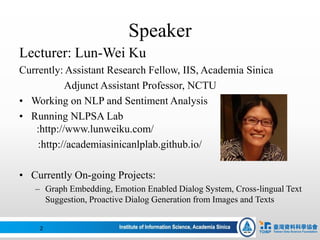 The document presents an overview of natural language processing (NLP), including its definition, applications, and challenges faced in the field. It discusses various tools and resources related to both English and Chinese text processing, as well as the significance of sentiment analysis in social media contexts. Additionally, it highlights the interdisciplinary nature of NLP, drawing connections to artificial intelligence, information retrieval, and machine learning.