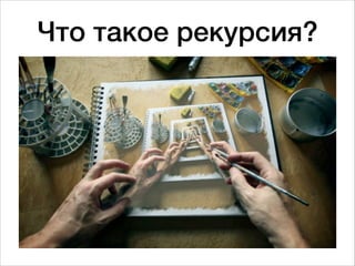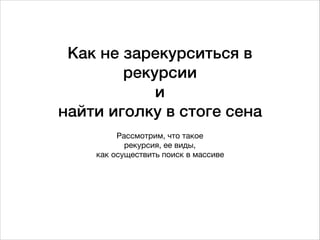 Документ обсуждает концепцию рекурсии, ее виды и примеры применения, такие как вычисление факториала и числа Фибоначчи. Он объясняет особенности, преимущества и недостатки рекурсии, а также затрагивает методы поиска в массиве, включая линейный и бинарный поиск, и описывает основы работы поисковых систем. Также представлены примеры кода для разных алгоритмов, связанных с рекурсией и поиском.