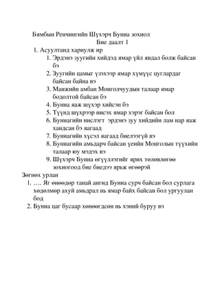 Бие даалт 1 1. Асуултанд хариулж ир 1. Эрдэнэ зуугийн хийдэд ямар үйл явдал болж байсан бэ 2. Зуугийн цамыг үзэхээр ямар хүмүүс цуглардаг байсан байна вэ 3. Манжийн амбан Монголчуудын талаар ямар бодолтой байсан бэ 4. Буниа яаж шүхэр хийсэн бэ 5. Түүнд шүхрээр нисэх ямар хэрэг байсан бол 6. Буниагийн нислэгт эрдэнэ зуу хийдийн лам нар яаж хандсан бэ яагаад 7. Буниагийн хүсэл яагаад биелээгүй вэ 8. Буниагийн амьдарч байсан үеийн Монголын түүхийн талаар юу мэдэх вэ 9. Шүхэрч Буниа өгүүллэгийг ярих төлөвлөгөө зохиогоод бие биедээ ярьж өгөөрэй Зөгнөх урлан 1. …. Яг өнөөдөр танай ангид Буниа сурч байсан бол сурлага хөдөлмөр ахуй амьдрал нь ямар байх байсан бол ургуулан бод 2. Буниа цаг бусаар хөнөөгдсөн нь хэний буруу вэ