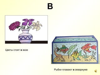 Документ описывает использование предлогов в русском языке через примеры с цветами, животными и предметами. Он иллюстрирует различные случаи употребления предлогов, таких как 'в', 'на', 'за', 'под', 'из-под', 'со' и 'между'. Также указана информация об оформлении работы и годе издания.