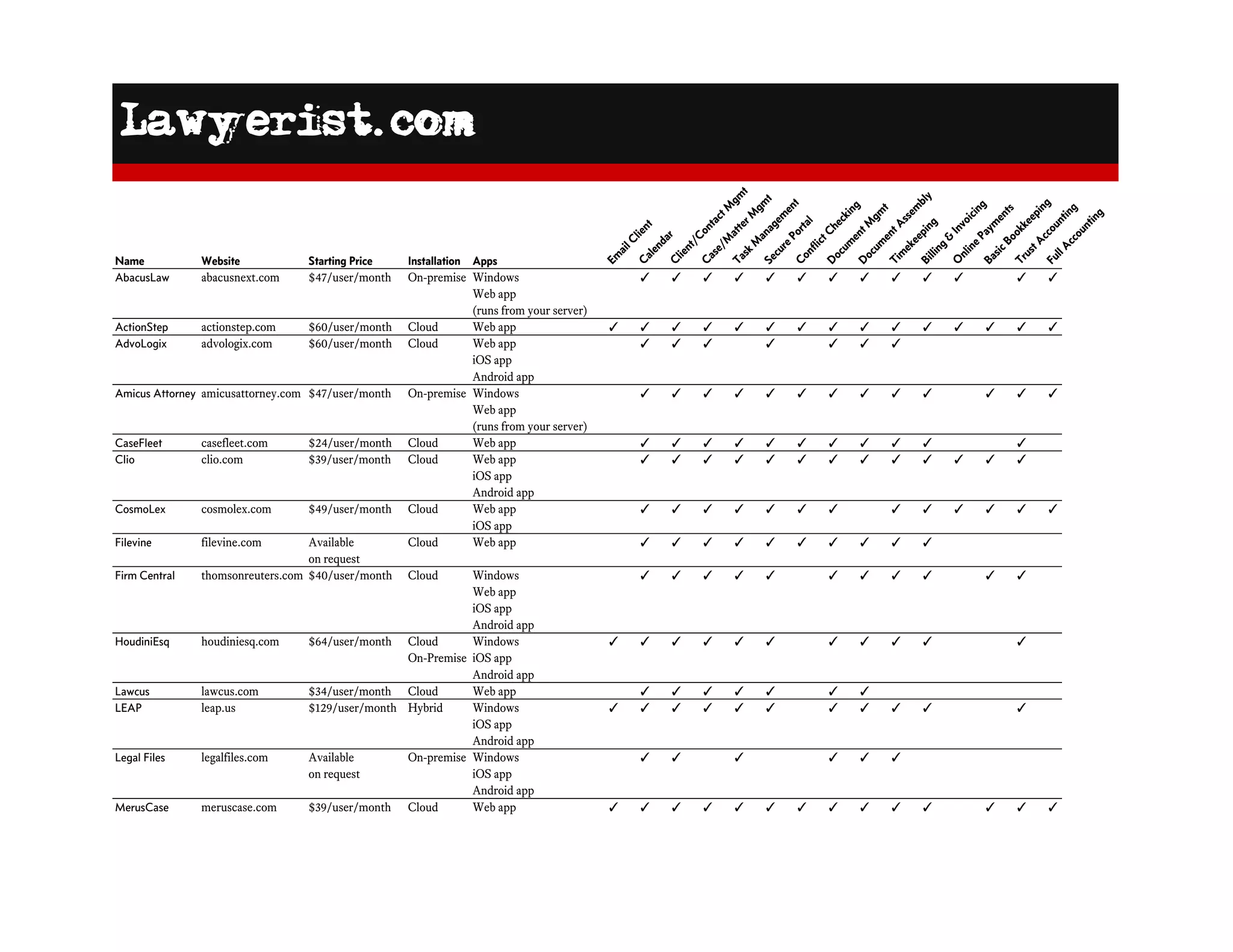 The document provides a list of various legal practice management software options, including their prices, installation types, and available apps. Each entry details features such as email client, calendar integration, task management, and billing capabilities. Options range from cloud-based solutions to on-premise installations, with monthly user fees varying widely.