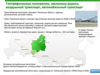 Документ содержит анализ социально-экономического развития Тюменской области, включая транспортную инфраструктуру, инвестиции и экономические показатели за 2009 год. Основное внимание уделяется промышленности, сельскому хозяйству, строительству и поддержке малого бизнеса в регионе. Особо выделяются ключевые инвестиционные проекты и программа государственной поддержки для стимулирования экономического роста.