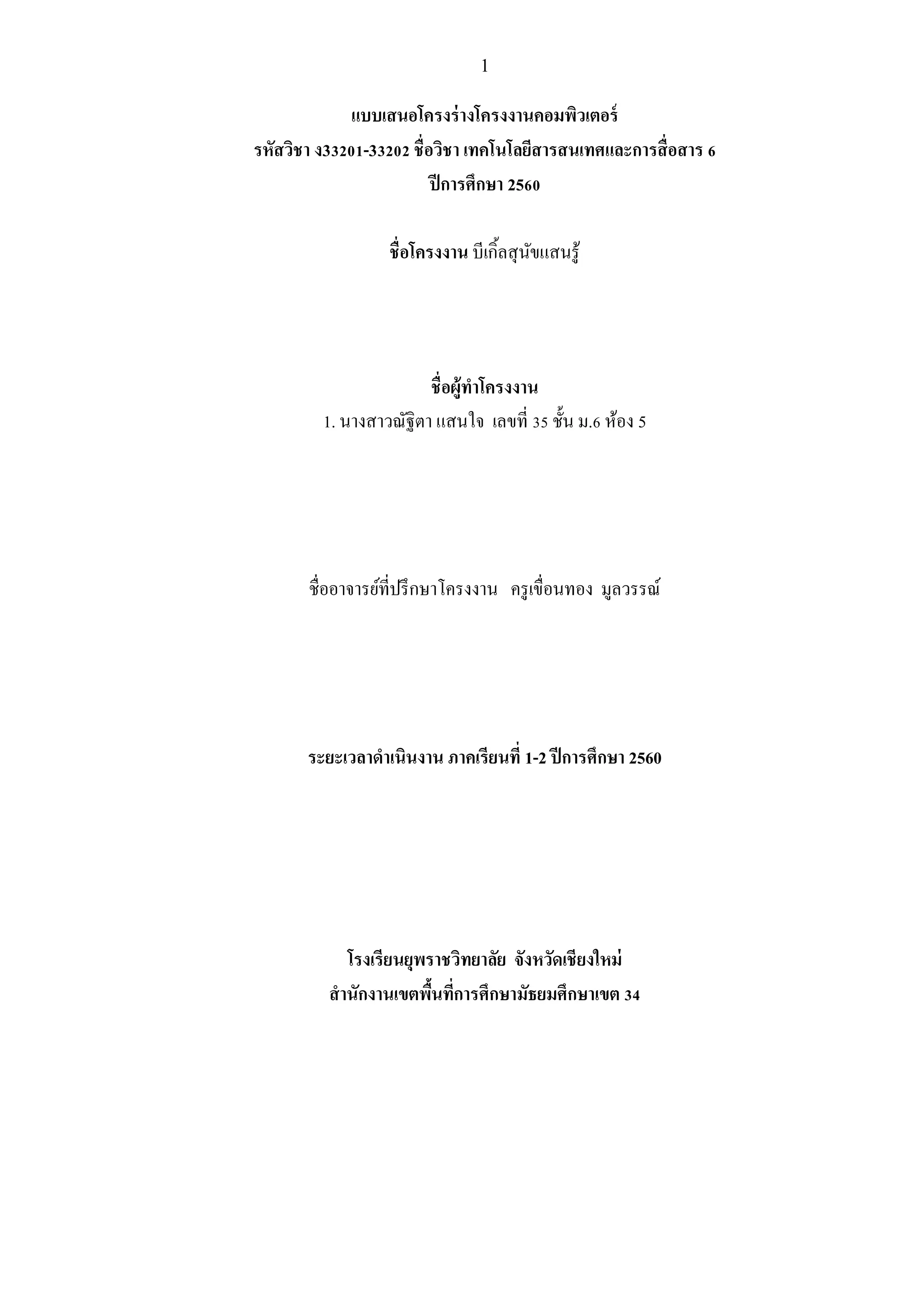 1 แบบเสนอโครงร่างโครงงานคอมพิวเตอร์ รหัสวิชา ง33201-33202 ชื่อวิชา