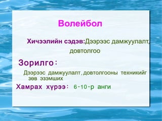 Волейбол Зорилго:Дээрээс дамжуулалт,довтолгооны техникийг зөв эзэмших Хамрах хүрээ: 6-10-р анги Хичээлийн сэдэв: Дээрээс дамжуулалт, довтолгоо - 2.