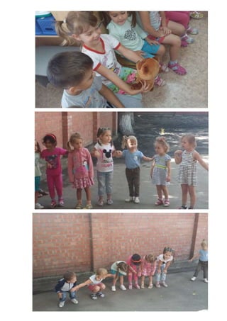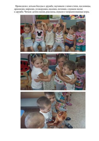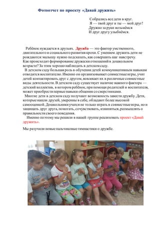 Документ представляет фотоотчет по проекту «давай дружить», который нацелен на формирование дружеских отношений у детей в дошкольном возрасте. Воспитатели играют ключевую роль в обучении детей коммуникативным навыкам через совместные игры и активности. Основные мероприятия включали беседы о дружбе, разучивание стихов и создание совместных творческих работ.