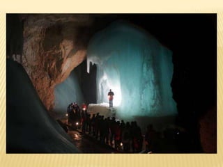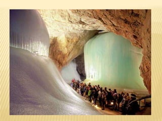 Το Eisriesenwelt, σταβουνά Hochkogel στην περιοχή Tennengebirge του Salzburg της Αυστρίας είναι το μεγαλύτερο σπήλαιο πάγων στον κόσμο. Στις αίθουσες τους υπάρχουν κάθε μορφής σχηματισμοί από πάγο, τεράστιες κολώνες και πύργοι από πάγο καθώς και πολύ εντυπωσιακοί παγωμένοι καταρράκτες !Με συνολικό μήκος πάνω από 40 χιλιόμετρα (!) ανακαλύφθηκαν τυχαία το 1879, αλλά οι κάτοικοι της περιοχής δεν έμπαιναν στο σπήλαιο καθώς φοβόντουσαν πως είναι η είσοδος της κόλασης ! Σήμερα έχει πάνω από 200.000 επισκέπτες τον χρόνο.Το σπήλαιο έχει θερμοκρασίες μονίμως κάτω του μηδενός και έτσι οι αρχαίοι πάγοι δεν λιώνουν ποτέ αλλά λόγω των αέριων ρευμάτων που δημιουργούνται αλλάζουν συνεχώς σχήμα.