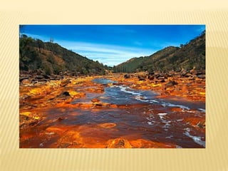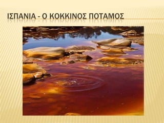 Το ποτάμι RioTinto,στα βουνά SieraMorena της Ανδαλουσίας, στην Ισπανία είναι γνωστό από την αρχαιότητα για τα παράξενα κοκκινο-κίτρινα νερά του. Τα αλλόκοτα χρώματα του οφείλονται στο γεγονός ότι περνάει από σημεία πλούσια σε διάφορα μεταλλεύματα και πετρώματα, τα οποία είναι υδροδιαλυτά (και αρκετά πλούσια σε οξέα) με αποτέλεσμα να έχει αυτές τις απίστευτες αποχρώσεις!Φυσικά ούτε λόγος να γίνεται για την καταλληλότητα του νερού για οποιαδήποτε χρήση! Μόνο για να το βλέπουν οι επισκέπτες είναι !