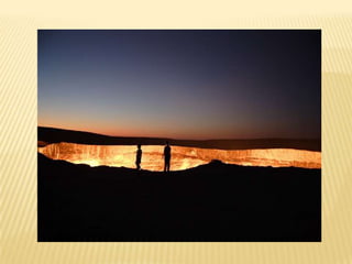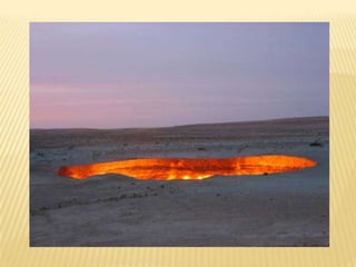 Δεν είναι ηφαίστειο- στην τρύπα αυτή καίει διαρκώς μια τεράστια φωτιά από φυσικό αέριο, το οποίο αναδύεται από τα έγκατα της γης, εδώ και 35 χρόνια συνεχόμενα! Η φωτιά ξεκίνησε όταν έγινε μια γεώτρηση σε εκείνο το σημείο που χτύπησε σε κάποιο (προφανώς τεράστιο) θύλακα φυσικού αερίου και .κατέρρευσε. Καθώς η περιοχή γέμισε (επικίνδυνο) φυσικό αέριο που απειλούσε την κατοικημένη περιοχή αποφασίστηκε να γίνει .ανάφλεξη του αερίου, δημιουργώντας αυτό το περίεργο αξιοθέατο, που είναι πλέον γνωστό σαν "η πύλη της κόλασης", ονομασία που μάλλον την αξίζει! Βρίσκεται κοντά στην πόλη Darvaz του Ουζμπεκιστάν.